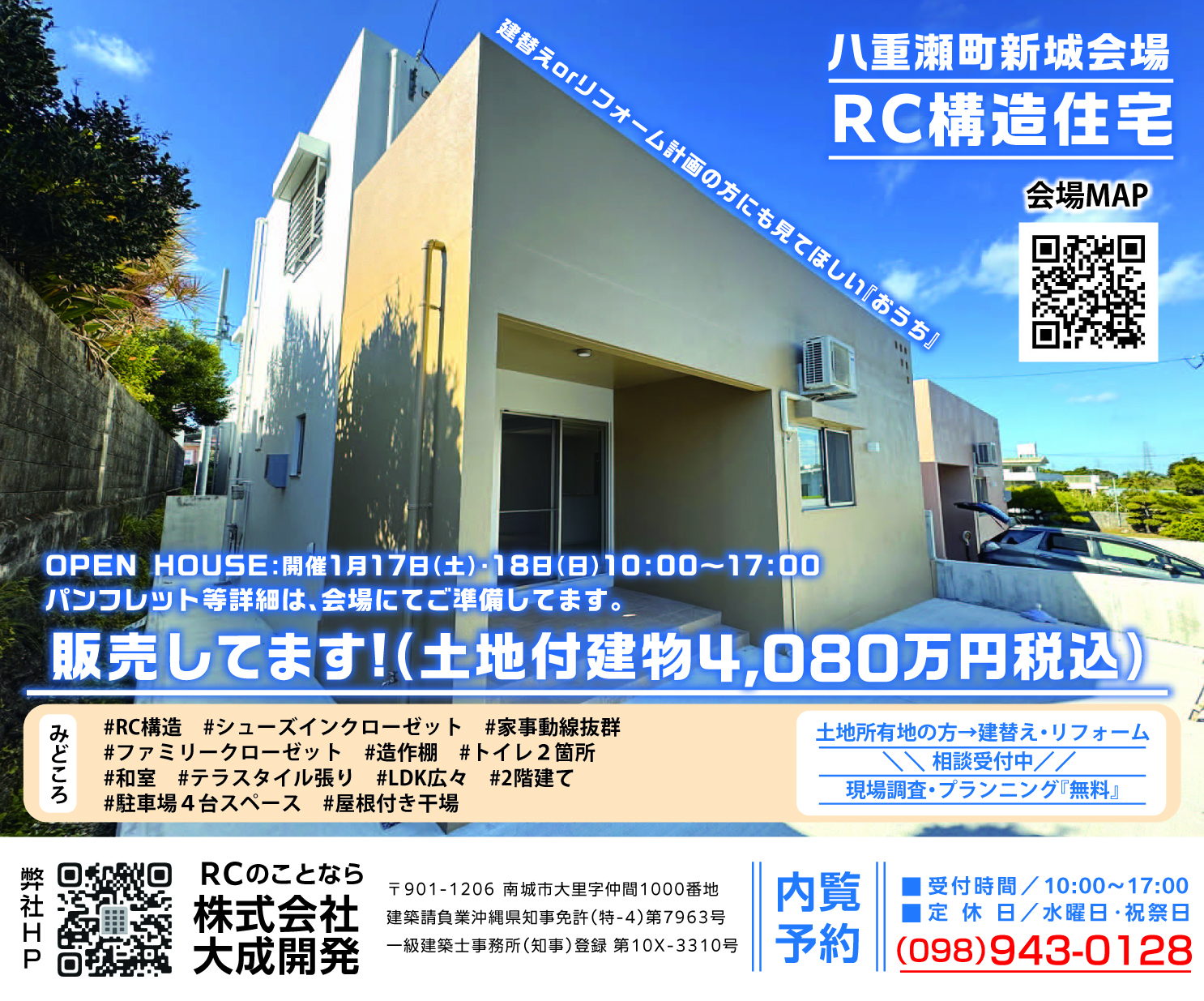 RC構造2階建て見学会(販売してます!4,080万円(税込) 2026年01月13日に更新しました 開催地 八重瀬町新城 開催日 令和8年1月17日(土)・18日(日) 開催時間 10時~17時迄 敷地面積 46坪 建物面積 30坪 おススメポイント 屋根付きテラスBBQが楽しめそう♪ 玄関・ポーチ広々◎ ぐるっとまわれる家事同線がいい◎ ファミリークローゼット兼パントリー(4帖) 子供の成長に合わせ将来、部屋を間仕切る事が出来ます。 物件画像 ※画像をクリックすると拡大表示されます。