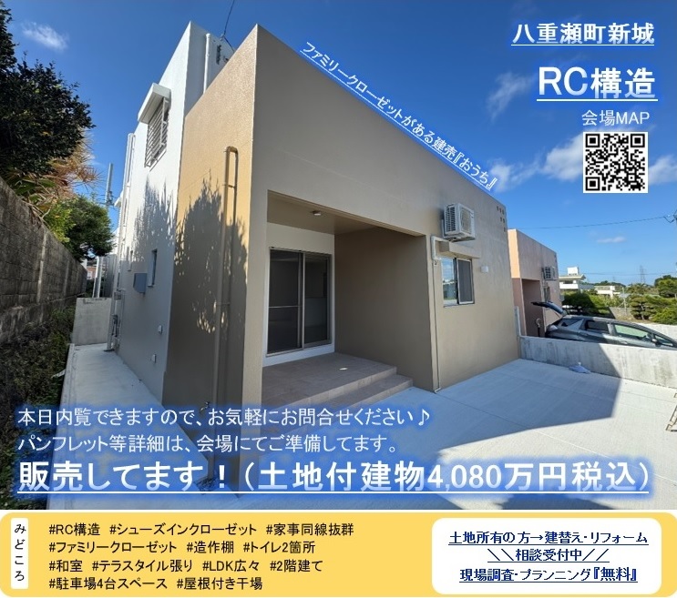 本日見学できます♪RC構造2階建て見学会(販売してます!4,080万円(税込) 2026年03月22日に更新しました 開催地 八重瀬町新城 開催日 本日見学できます。完全予約制(水曜・祝日は、定休日) 開催時間 10時~17時迄 敷地面積 46坪 建物面積 30坪 おススメポイント 屋根付きテラスBBQが楽しめそう♪ 玄関・ポーチ広々◎ ぐるっとまわれる家事同線がいい◎ ファミリークローゼット兼パントリー(4帖) 子供の成長に合わせ将来、部屋を間仕切る事が出来ます。 物件画像 ※画像をクリックすると拡大表示されます。